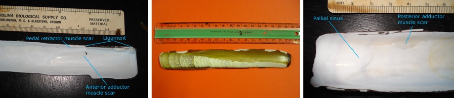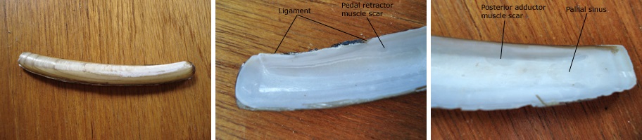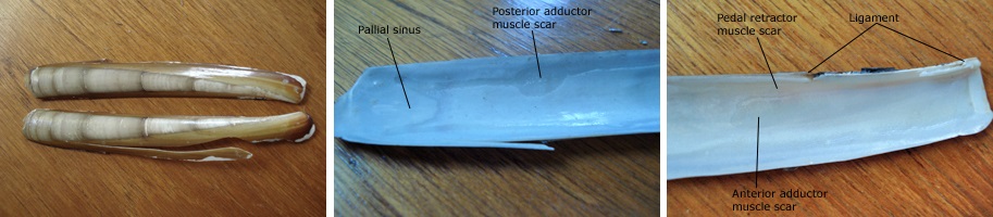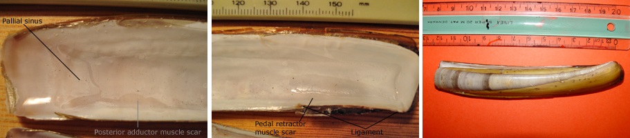 Ensis magnus – external shell (left), Ensis magnus – interior (middle) & Ensis magnus – interior (right), Photo by Kathe Rose Jensen