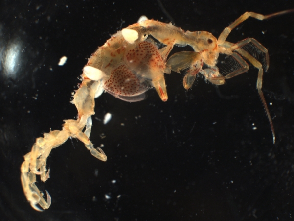 Caprella mutica, female with brood pouch, but no visible embryos. Photo Simon Blauenfeldt Leonhard Orbicon and Vattenfall A/S (copyright).