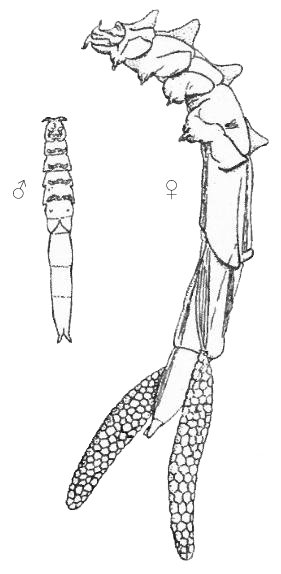 Mytilicola intestinalis, male and ovigerous female (from Hockley 1951)